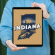 Stylish poster print features retro style scenic state silhouette of Indiana on light brown background.