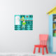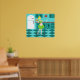 With this Retro Kitchen Poster, you can have your pie and eat it, too. This kitschy, minimalist art drawing features a perfect 1950's housewife, in her mid century modern kitchen. The beautiful baker is wearing a flouncy, green dress and a white apron with red detailing. Not a hair on her blonde head is out of place. In one hand, she is holding the fruit of her labour--a gorgeous, lattice topped, fruit pie. One glance and you'll know that her flaky pie crusts are second to none. She is standing on an aqua and teal chequerboard floor, which is undoubtedly clean enough to eat off of. Against an aqua wall, we see teal cabinetry with aqua trim work, a red countertop, red drawer pulls, and black starburst accents. A red, starburst clock is hanging on the wall. To the side, there is a state of the art, white refrigerator with silver handles. At least, the fridge was state of the art in 1950's. Now, it's just plain dreamy! Whether you're Suzie Homemaker or simply have an affinity for all things vintage, you're sure to love this scrumptious slice of Americana.