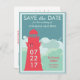 This Save the Date card has a retro poster style. It features a lighthouse on a sky background with clouds and sea gulls flying. This design is eye-catching is perfect for lighthouse lovers, or for an event to be held at the sea shore.