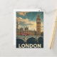 Send a slice of Great Britain with this retro-style postcard. It features a stunning, vintage-look illustration of London's most famous landmarks, including the iconic Big Ben, the Houses of Parliament, and a classic red double-decker bus crossing a bridge. This postcard is perfect for sharing your travel adventures or as a memento for anyone who loves London's timeless charm.