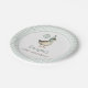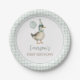 Featuring a delightful illustration of a charming duck in a bow tie and party hat, this paper plate is framed by a soft pastel green gingham border for a whimsical and rustic look.