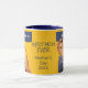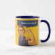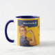 Cette tasse présente l'image de l'affiche vintage de la Seconde Guerre mondiale de Rosie le Riveter montrant sa force de bras, et la légende qui dit, "Maman peut le faire !" L'image est principalement en bleu et or coloré. Le texte personnalisable dans le centre dit actuellement "Meilleure Maman Ever" et "Fête des Mères 20XX" mais peut être facilement changé ou supprimé.