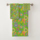 Towel set features bright and colourful throwback pattern of multi-ringed circles in a variety of sizes and colours on grass green background.