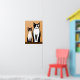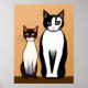Poster in an illustration of a Mid-Century Modern inspired, black and white cat and kitten, on a mustard gold background