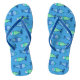 Mid-Century Modern, whimsical, retro fish pattern flip-flops, in turquoise, aqua, lime green and sky blue, on a deep cerulean blue background