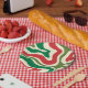 Trippy retro modern vibe Liquid Swirl Christmas abstract pattern in olive green, red, and cream. For a fun 60s 70s slightly psychedelic xmas. By Kierkegaard Design Studio.