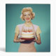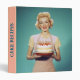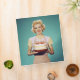 A cheerful mother with a 1950s vintage aesthetic, wearing a polka-dotted blouse and apron, smiles brightly while holding a beautifully decorated cake topped with strawberries and candles. The vibrant teal background enhances the retro vibe, evoking nostalgia and warmth. Perfect for themes of baking, motherhood, celebration, and retro style.