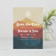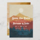 A trendy wedding save the date announcement for your upcoming mountain or forest wedding. This design features a subtly distressed illustration of a mountain and forest landscape in yellow, orange, and navy blue, overlaid with your wedding details in white retro font. add your favourite photo on the reverse.