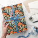 Gift wrap with an illustration of retro mushrooms, vintage flowers in vintage colours of dark blue, orange and beige.