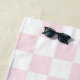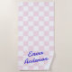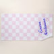 Beach towel featuring your name in blue a blue, retro style font over a pale pink and white chequerboard pattern.