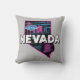 Retro style throw pillow design features Nevada state silhouette with iconic skyline and Las Vegas sign.