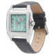 A watch with an illustration of birch trees with orange birds sitting on their branches. Retro green coloured background.