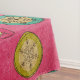 A beautiful whimsical vintage look pink tablecloth with lots of pretty snowflake orbs of mustard, aqua blue, and hot pink on a pink background.