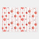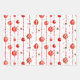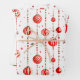 This wrapping paper features a repeating pattern of red and white Christmas ornaments hanging from vertical strings of red beads. There are also small, stylized red stars scattered throughout the white background. Some ornaments are solid red, while others have red and white stripes.