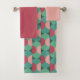 This towel set has a light pink washcloth, a darker pink hand towel, and a bath towel with a mid-century modern design of ovals with semi-circles inside them in retro Christmas colours.