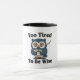 A cozy mug featuring a retro owl and the universal feeling of being tired.