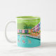 This Retro Palm Springs Hotel mug is as fabulous as it is kitschy. It's garishly bright rainbow facade is dwarfed by the lime green mountains and spectacularly iconic palm trees. There's a party going on by the pool with bathing beauties and muscle men soaking up some vitamin D while watching the synchronized swimmers perform. It appears that only one of the swimmers knows the routine; the other four are out of sync. How embarrassing for them! The only thing that would make this design say “Palm Springs” more would be if it was written in the clouds. Oh, wait. It is!