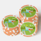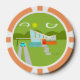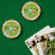 These Retro Palm Springs House with Car Poker Chips are a mid century modern lover’s dream. The minimalist art design features a sleek orange and glass house with a dramatically sloping checkmark shape roof. The red door offsets the orange stone planter filled with greenery and the decorative turquoise cinderblock privacy screen. Staggered concrete blocks form the perfect walkway through the lush, green lawn. A white carport offers shelter to a turquoise and white classic 1950’s car with fins. The car is perfect for driving around the green, rounded mountains in the distance. The kitschy 1960’s style house looks like a shady oasis from the hot, Palm Springs sun.