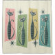 My original vector illustration of retro style patchwork tabbies and starbursts, in blue grays and pinks on hatched pink, green, yellow and blue, with an off white/tan background.