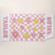 Multi Custom Colour and Font Style - personalized beach towel with name, happy smile face and retro chequered background  and flowers. Customize all colours as you wish! Cool idea for Bridesmaid gift!
