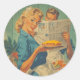 A cheerful 1950s housewife presents a delicious pie while her husband reads the newspaper, capturing classic mid-century Americana with vibrant vintage charm. Ideal for nostalgic greeting cards.
