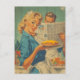 A cheerful 1950s housewife presents a delicious pie while her husband reads the newspaper, capturing classic mid-century Americana with vibrant vintage charm. Ideal for nostalgic greeting cards.