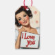 A vibrant illustration in classic 1950s pin-up style. The image features a glamourous woman with vintage curls, bold makeup, and a radiant smile. She holds a sign with a loving message, “I Love You,” set against a backdrop of delicate pink roses. The overall aesthetic captures the romantic and playful vibe of mid-century pin-up art.
