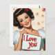 A vibrant illustration in classic 1950s pin-up style. The image features a glamourous woman with vintage curls, bold makeup, and a radiant smile. She holds a sign with a loving message, “I Love You,” set against a backdrop of delicate pink roses. The overall aesthetic captures the romantic and playful vibe of mid-century pin-up art.