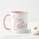 This simply adorable two-toned Easter mug says Happy Easter in a pastel pink and blue retro script with a cute pair of bunny rabbit ears on top of the 'E' in Easter.