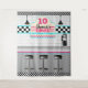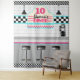 Unique and Fun! Retro Diner Countertop Backdrop with Pink and Blue colours and Chequerboard pattern. Customize with name, age or initial the menu banner. ©2021 Miss Sassy Party Designs