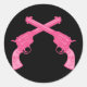 These t-shirts and other items are printed with a retro image of a pair of pink six shooter pistols.