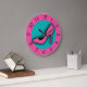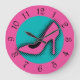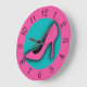 For fashion lovers, this retro style clock is printed with a high heel shoe in a pink and aqua colour scheme.