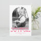 Cute holiday photo card featuring your vertical photo inside of a white arch frame. "Joyful" is displayed in fun, pink retro lettering with your name and the year shown below. The retro Christmas card reverses to display a pink and white diagonal stripe pattern.