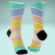 Striped socks in retro pink, ochre yellow and turquoise stripes with a white 'seam' at the back.