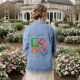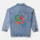This denim jacket has a mid-century modern design of red, green, orange and plaid rounded rectangles overlapping each other. If you like different colors, message me.