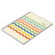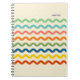 This budget friendly notebook features a retro trendy take on stripes with a ric rac wave in weathered tones of red, green, orange, blue, and yellow on an aged white or charcoal grey background. One line of editable text makes for easy customization with a name, event or subject.