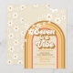 Seven is a Vibe! Retro inspired 7th birthday invitation with 70's style fonts and colours, rainbow, and daisies in fall colours. brown, tan and orange colours.