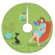 This Retro Reading Woman Christmas Tree Skirt features a 1960's style, minimalist art, cartoon drawing of a woman who has her priorities in order. This delightful bookworm is entranced in a real page-turner. The shapely brunette is wearing an aqua dress and red glasses, while holding a blue book. She is seated in a comfy, red egg chair. In front of her, a sleek, black cat in a teal collar is enjoying the peace and quiet that comes from living with a bibliophile. Both woman and cat are in a stylish green room. Overhead, there is a kitschy pendant lamp in shades of yellow and turquoise. To the side, there is a lush, tropical, potted plant in an aqua flowerpot. Kitty, if you need something, you'll have to wait until she finishes this chapter!