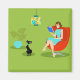 This Retro Reading Woman Magnet features a 1960's style, minimalist art, cartoon drawing of a woman who has her priorities in order. This delightful bookworm is entranced in a real page-turner. The shapely brunette is wearing an aqua dress and red glasses, while holding a blue book. She is seated in a comfy, red egg chair. In front of her, a sleek, black cat in a teal collar is enjoying the peace and quiet that comes from living with a bibliophile. Both woman and cat are in a stylish green room. Overhead, there is a kitschy pendant lamp in shades of yellow and turquoise. To the side, there is a lush, tropical, potted plant in an aqua flowerpot. Kitty, if you need something, you'll have to wait until she finishes this chapter!