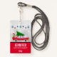 Name badge with a cool old red car carrying a green christmas pine tree on its roof and a present tucked away in the open trunk.