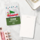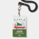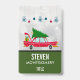 Name badge with a cool old red car carrying a green christmas pine tree on its roof and a present tucked away in the open trunk.