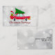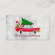 Business cards with a cool old red car carrying a green christmas pine tree on its roof and a present tucked away in the open trunk.