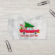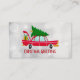 Business cards with a cool old red car carrying a green christmas pine tree on its roof and a present tucked away in the open trunk.
