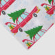 Tissue paper with a cool old red car carrying a green christmas pine tree on its roof and a present tucked away in the open trunk.