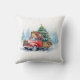 Watercolor retro red truck with Christmas pine wreaths, tree and red bows in winter forest.