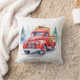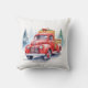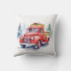 Watercolor retro red truck with Christmas pine and snowflakes in winter forest