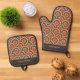 Add a touch of retro charm to your kitchen! This oven mitt set features a groovy abstract circle pattern in shades of red, gold, teal and black. Personalize with a name or other text of your choice using the personalization feature! Perfect as a thoughtful gift or a treat for yourself.
