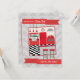A cooking party invitation featuring an illustration on front of a retro inspired red kitchen decorated with black and white floor. Personalize the text on front and back. Background is light grey with zig zags.