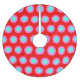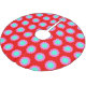 This vibrant and playful holiday Christmas tree skirt features a fun pattern of mod 60s boho pop flowers in pink and turquoise on a red background.