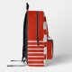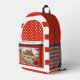 Red and white backpack featuring a retro striped design with polka dots and your custom photo (optional; you can also leave the landscape with red poppies if you like). Beautiful for travel or school.